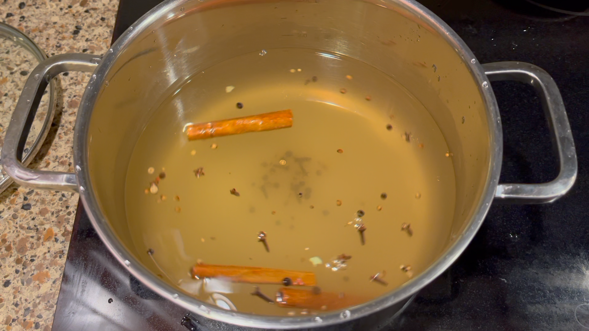Bring these ingredients to boil, then simmer for 5 minutes. After simmering, remove let the pickling solution from the heat to cool down. You do NOT want to add hot pickling solution to the Herring as it’ll cook them.