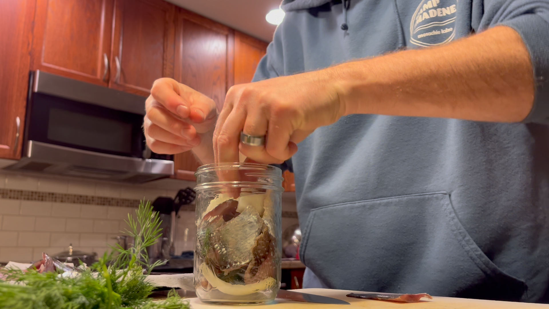 Pro Tip: When adding Herring into the jars, I like to roll it up a little bit so it makes a cylinder shape, which is easier to put into jar. I’d recommend rolling it up with skin facing outward, because it looks way nicer!