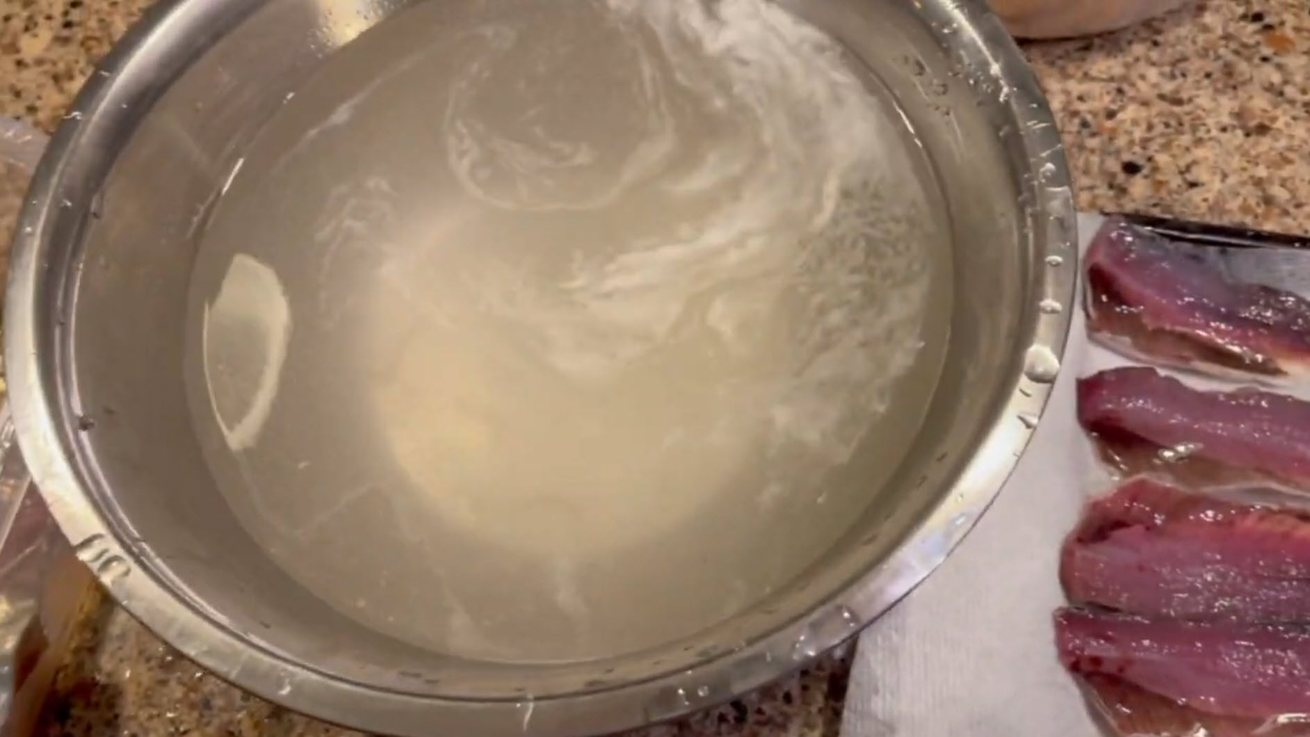 After the dry brining process is over, you may still have blood or even some entrails on the herring. This is the step to clean them up completely before putting them into jars. In this step, I like to have a large cold bowl of water and a tray with paper towel beside it.