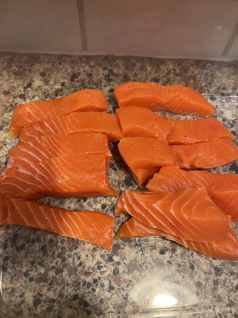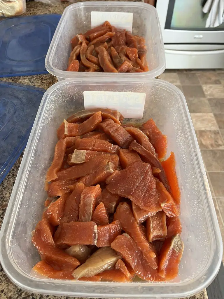 Amounts are subjective to the amount of fish you’re processing. For the amounts below, I processed 3 adult Chinook (King) Salmon for reference.